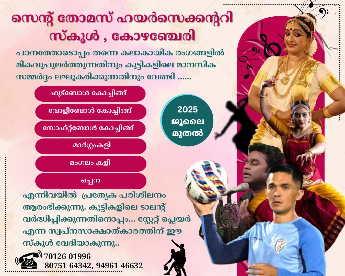 കേരളത്തിലെ മറ്റു സ്കൂളുകളിൽ ഉള്ള എല്ലാ curricular/ എക്സ്ട്രാ curricular ആക്ടിവിറ്റീസിനും ഭൗതിക സൗകര്യങ്ങൾക്കും ഒപ്പം വിശാലമായ വലിയ ഗ്രൗണ്ട്, 2025 july മുതൽ പ്രഗത്ഭ TRAINERS & COACHES നയിക്കുന്ന FOOTBALL, VOLLEYBALL, SOFTBALL, മാർഗംകളി, മംഗലംകളി, ഒപ്പന ഇവയുടെ സ്പെഷ്യൽ കോച്ചിംഗ് വഴി കുട്ടികൾക്ക് State player എന്ന സ്വപ്ന സാക്ഷാൽ  ക്കാരത്തിനു വേദിയാകുന്ന അച്ചടക്കം ഉള്ള സ്കൂൾ. നിരവധി A+ കൾ നിറഞ്ഞ ബെസ്റ്റ് റിസൾട്ട്‌