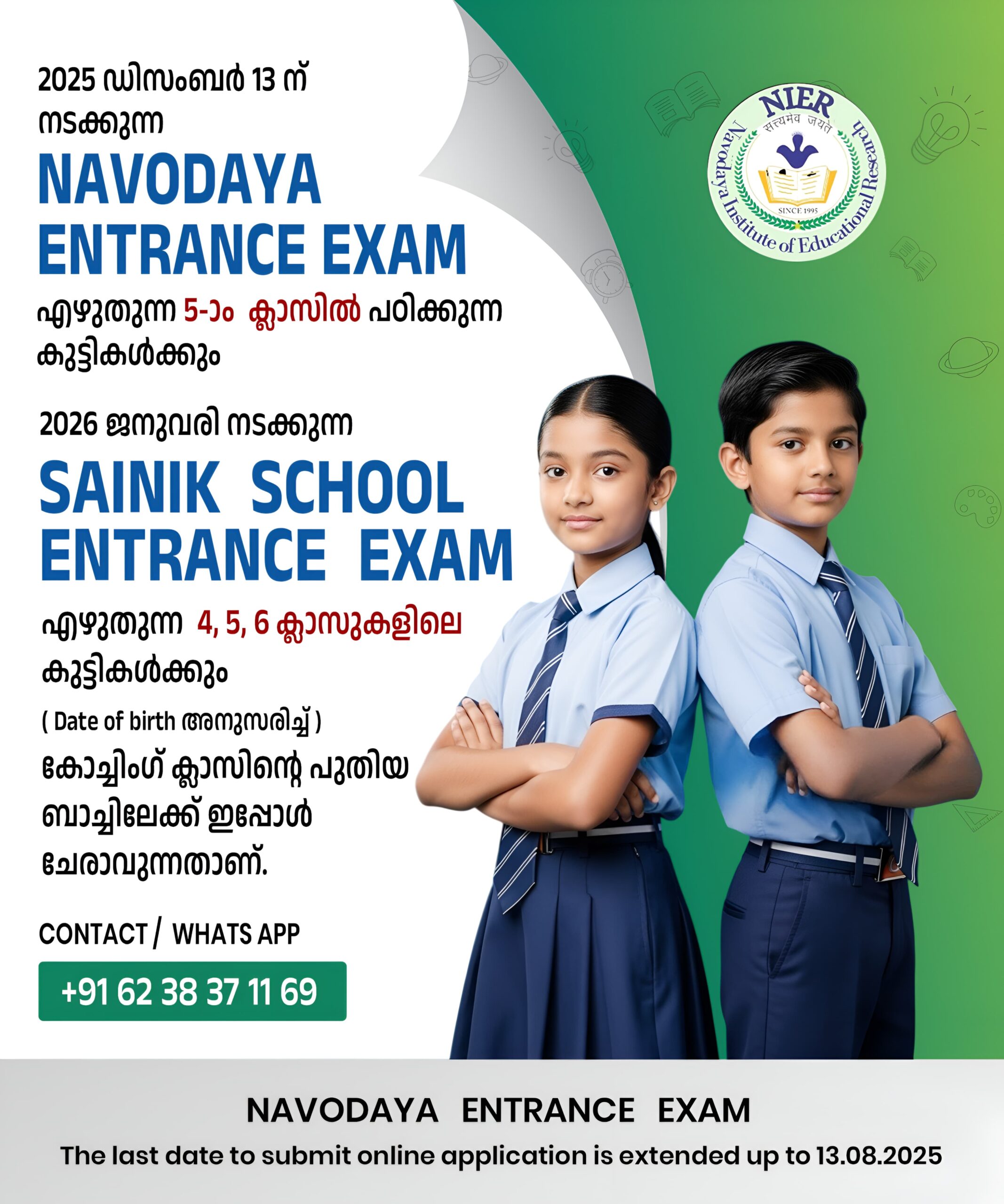 ⚡ ആറാം ക്ലാസ്സുകളിലേക്കുള്ള സൈനിക് സ്കൂൾ എൻട്രൻസ് ( Date of birth അനുസരിച്ചു ഇപ്പോ 4, 5, 6 ക്ലാസ്സുകളിൽ പഠിക്കുന്നവർക്ക് കോച്ചിംഗ് ക്ലാസിനു ചേരാം.1995 ഇൽ സ്ഥാപിച്ച NIER കേരളത്തിൽ ഈ മേഖലയിലെ ഏറ്റവും വലുതും മികച്ചതും ആദ്യത്തേതും ആയ സ്ഥാപനം ആണ്. 17000 ഇൽ അധികം കുട്ടികളെ വിജയിപ്പിച്ച NIER ഇൽ വളരെ ചെറിയ ഫീസ് ആണ് ഈടാക്കുന്നത്.
